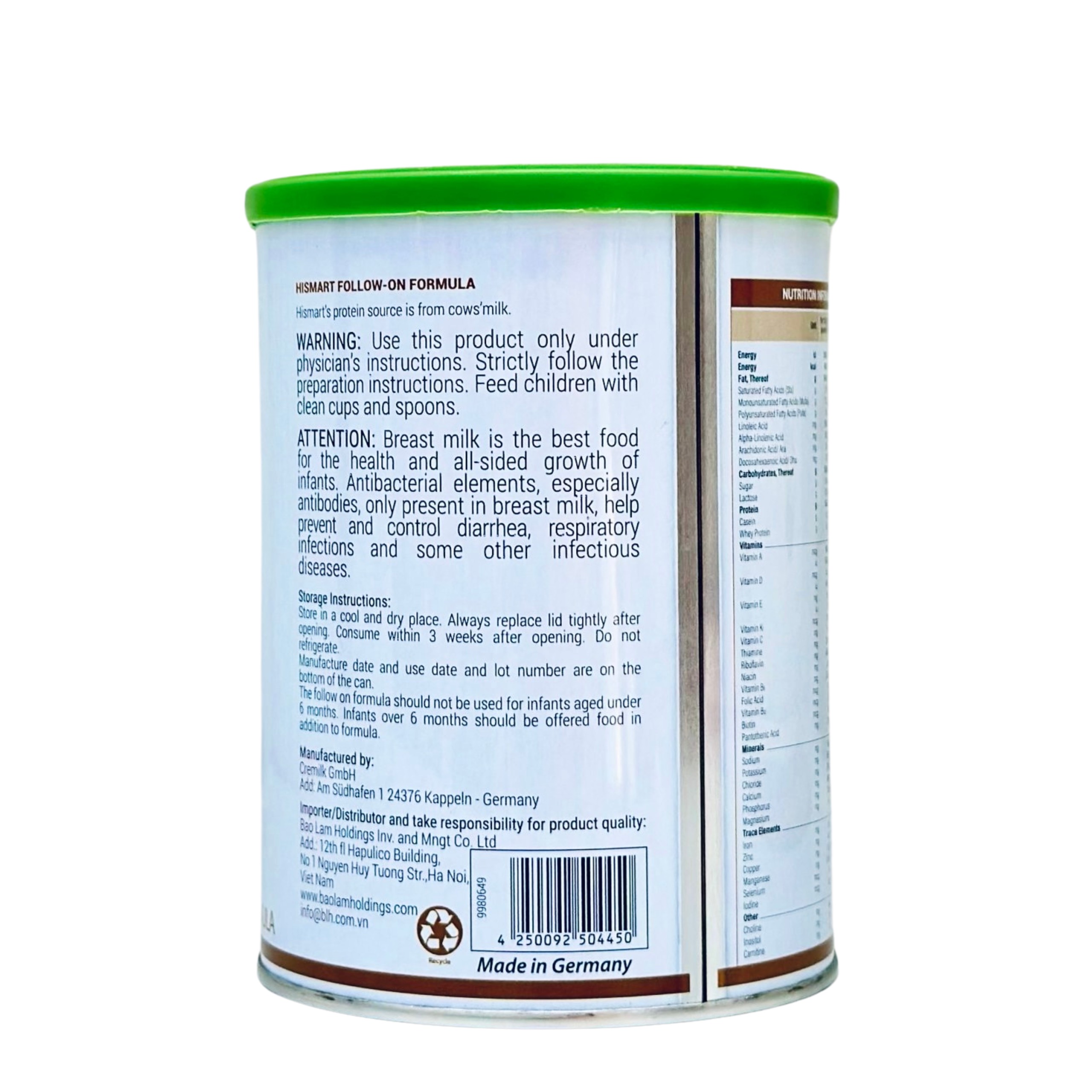 Hismart Germany Milk với công thức đặc biệt bổ sung năng lượng cao, chú trọng phát triển trí não song hành cùng chiều cao.